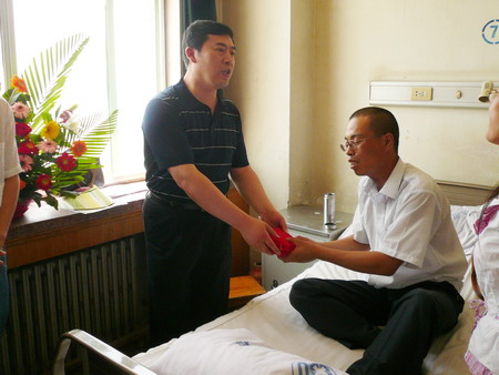6月24日,公司總經(jīng)理孫龍平,黨總支書記張玉琴及人力資源部部長姜作棟等一行,專程到德州人民醫(yī)院,將寄托著廣大員工深情厚誼的28150元捐款送到了孫富強的病榻前。鼓勵他要積極樂觀,堅定戰(zhàn)勝病魔的信心,期盼著他早日康復,重返工作崗位。