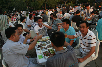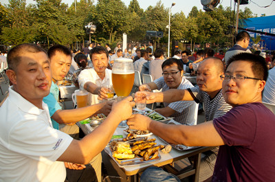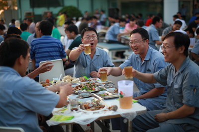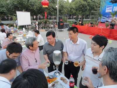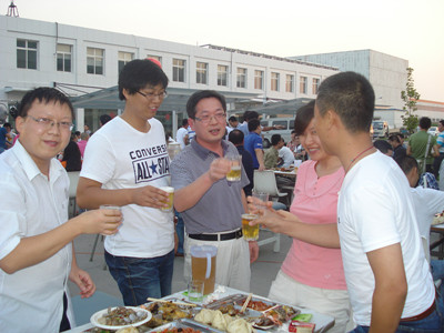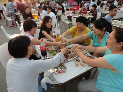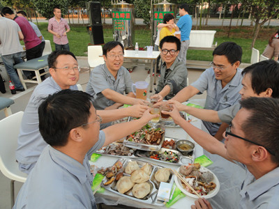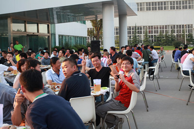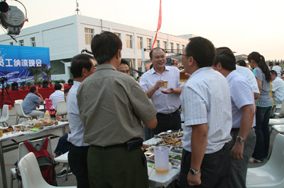 17:30分, “第四屆員工納涼晚會”正式開始。首先是員工聚餐。近400名員工,伴著歡快的樂曲聲,推杯換盞,大快朵頤。公司總經(jīng)理志賀進、常務(wù)副總經(jīng)理王正軍等公司領(lǐng)導(dǎo)走入員工中,與員工們親切交談,敬酒祝愿,整個會場洋溢著一張張歡樂的笑臉。