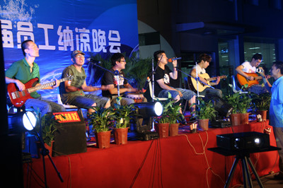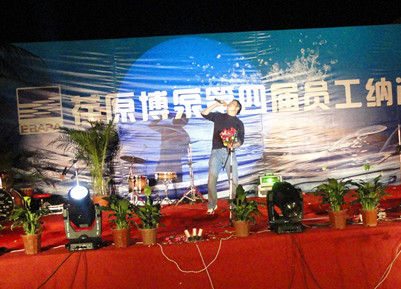 18:30分,晚會節(jié)目正式開始,首先在晨曦樂隊激情飛揚的搖滾歌曲聲中拉開了晚會的序幕。晚會節(jié)目有獨唱、小合唱、舞蹈等等,演員們的精彩表演,博得了員工們陣陣掌聲和喝彩。特別是生產(chǎn)部門女職工排練的舞蹈,動感十足,展示了女員工的多姿多彩的精神風(fēng)貌。常務(wù)副總經(jīng)理王正軍的一曲豪邁的《紅旗飄飄》,抒發(fā)了荏原博泵員工的愛國情懷;北京事務(wù)所的王信東部長帶來了抒情歌曲《別問》;王虹權(quán)、袁磊、趙喜鵬、周新菊、肖旭、竇群、蔣祺、張雷雷、徐道義、董旭光等員工先后表演了自己準備的節(jié)目;職工子女表演的拉丁舞更是把晚會的氣氛推向高潮。