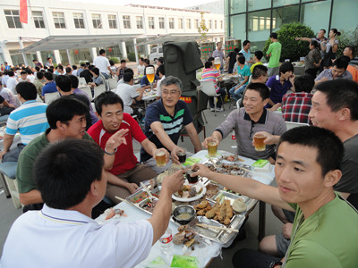 24日下午,公司辦公樓前,擺放著一排排桌椅,員工們從餐廳端著盛滿豐盛食物的餐盤,擺放在餐桌上。南面的舞臺上,工作人員在緊張的調(diào)試音響,兩只紅色的氫氣球飄揚在空中,在蔚藍的天空映襯下,格外的鮮艷,為整個會場增添了喜慶的氣氛。