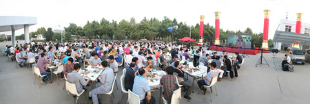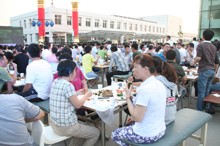 下午5點(diǎn),在夕陽的映照中,公司辦公樓前,忙碌的員工穿梭在會(huì)場,辦公樓南面已搭建好舞臺(tái),碩大的LED屏矗立在舞臺(tái)上。舞臺(tái)兩側(cè)各豎立著兩個(gè)團(tuán)結(jié)柱。舞臺(tái)前的空地上,已擺放好63張桌子,每張桌子配放6把椅子。桌子上,豐盛的飯菜已放好,靠西邊的草坪旁,是備好的新鮮的青島扎啤。
