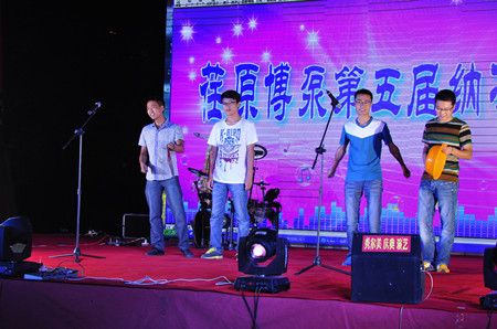 18:00,文藝演出正式開始,首先是搖滾樂隊(duì)帶來的勁爆歌曲,將晚會(huì)現(xiàn)場帶入了熱烈的氛圍。晚會(huì)上,有抒情懷舊的經(jīng)典老歌,有驚艷柔美的女工舞蹈,有激情四射的魅力街舞,還有新員工自編自演的三句半,更有抒發(fā)對(duì)公司深厚情感的詩朗誦《騰飛吧,荏原博泵》。有公司領(lǐng)導(dǎo)的獻(xiàn)唱,有普通員工的表演。每一個(gè)節(jié)目,都凝聚了員工的心聲,每一個(gè)節(jié)目都飽含了員工的熱情。在晚會(huì)上,公司常務(wù)副總經(jīng)理王正軍先生深情地說;今天是個(gè)歡樂的日子,荏原博泵歷經(jīng)八年的發(fā)展,從現(xiàn)在開始已經(jīng)步入了健康發(fā)展的軌道。今年公司訂單已達(dá)五個(gè)億,下一步就是生產(chǎn)、制造、交貨要交給在座各位,希望大家就像一臺(tái)機(jī)器的每個(gè)部件一樣,齊心協(xié)力配合好,公司的經(jīng)營成果會(huì)與大家共享!王總也一改往日的豪情,演繹了一首《風(fēng)往北吹》,表現(xiàn)了一個(gè)鐵血男兒柔情的一面。